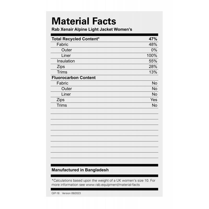 Dametilpasset design med kroppskartlagt isolasjon, under-hjelm-hette med elastisk kant, lett VISLON® glidelås med isolert klaff, håndlommer og pakkbar brystlomme med festeløkke, elastiske mansjetter, artikulerte ermer og justerbar nederkant.