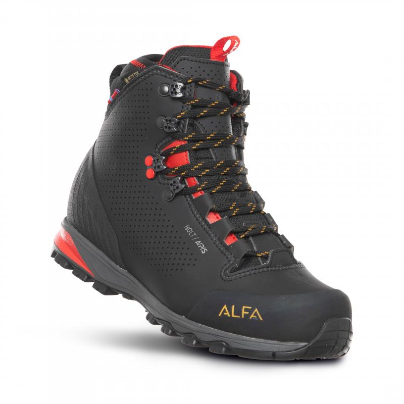 HOLT A/P/S GTX® W er en lett. halvhøy tursko for turer med lett til middels tung oppakning. Støvelen er kledd i Alfa Air™ vedlikeholdsfritt yttermateriale. Gore-Tex® kombinerer vanntetthet og pusteevne og sørger for at føttene holdes tørre og komfortable. selv på lange og varme dager. Den unike Vibram® Grip ARG sålen er spesielt tilpasset nordisk natur og sikrer godt grep selv på fuktig stein. Instant komfort mellomsåle produsert i lett EVA med god støtdemping.
