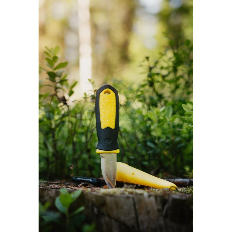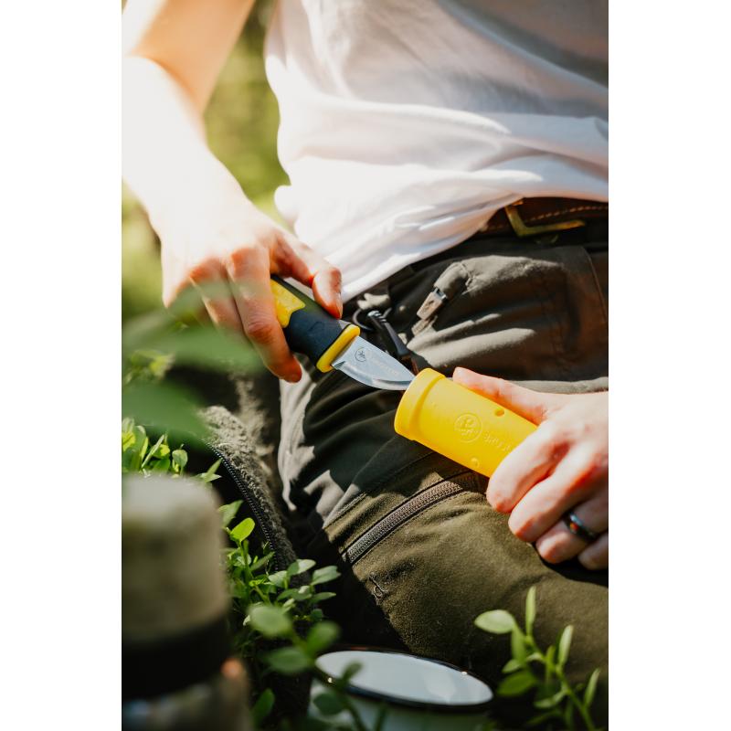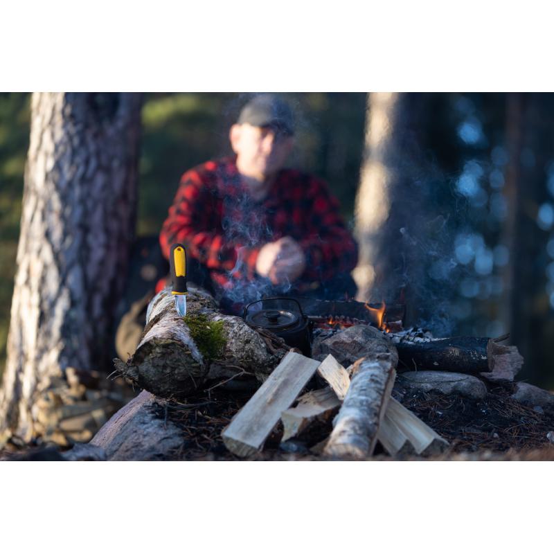 En liten, kompakt og skartp turkniv, perfekt for turer i naturen eller som en robust arbeidskniv. Enkel å ha med seg, enten festet i beltet eller på sekken via praktisk karabinkrok.