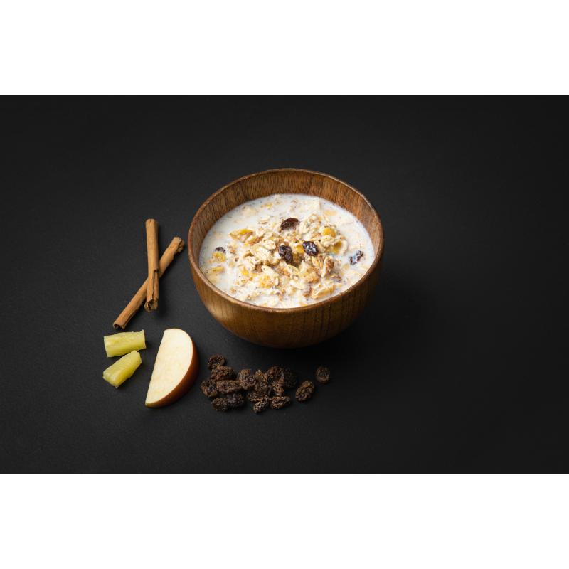 Ingredienser 62% Müsli (havregryn, helkorn hvete, 15% rosiner, 10% ananasbiter (sukker, ananas), maismel, havremel, sukker, salt, byggmalt), 31% tørrmelk (skummet tørrmelk, sukker, 1,8% kanel), 7% eplebiter. Allergener: gluten, laktose, melk.