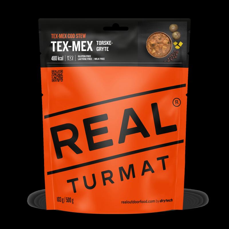 REAL Turmat Tex-Mex Torsk forener den friske smaken av arktisk torsk med en Tex-Mex-vri. Dette gir en unik og smakfull opplevelse på tur. Denne retten er laget med fersk torsk fra Norges anerkjente skreifiske, som kun er tilgjengelig fra januar til mars. Torsken kombineres med poteter, gulrøtter og en spennende blanding av Tex-Mex-inspirerte ingredienser som mais, paprika, chili, hvitløk, spisskummen og bønner. Hver munnfull byr på en deilig fusjon av norske tradisjoner og livlige Tex-Mex-smaker, perfekt for friluftsentusiaster, turgåere og campere som ønsker å prøve noe nytt. Real Turmat har forbedret teksturen og utseendet på denne retten ved å kutte gulrøttene i større biter og bruke mindre fiskebiter. Dette sikrer en bedre konsistens etter rehydrering, slik at måltidet ikke bare smaker godt, men også ser fristende ut når du er ute i naturen.