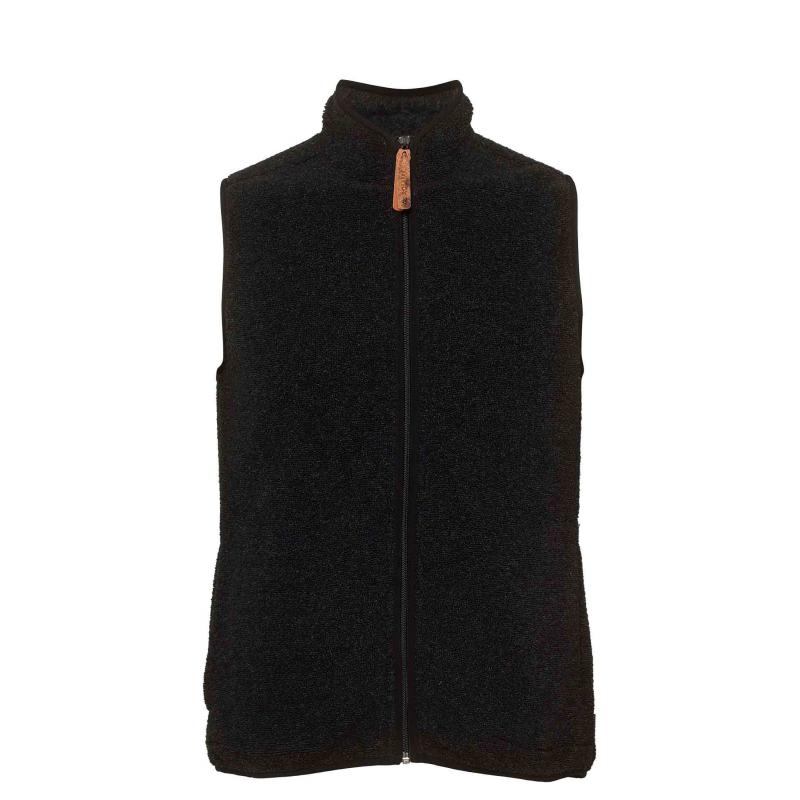 Vesten har en høy krage, dype lommer på sidene og elastiske kantbånd for optimal komfort og passform. Den har en fleece-lignende innside med børstet ull som isolerer godt, og ullen er resirkulert fra overskuddsmateriale fra vår egen fabrikk i Estland. Bruker du vesten som mellomlag vil konstruksjonen på utsiden bidra til luftdannelser mellom lagene, som igjen isolerer godt. Vi har sett på de mest bærekraftige løsningene og logo og zip puller er laget av fiskeskinn. Dette er den ultimate vesten til både friluftsliv og til hverdags.