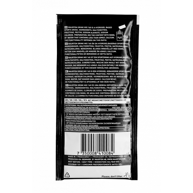 Maurten Drink Mix 160 er en karbohydratdrikk for utholdenhetsidretter som bruker Hydrogel Technology. Den inneholder 40 gram karbohydrater per 500 ml vann. Når du blander Drink Mix 160 med vann, får du en hydrogel sportsdrikk som inneholder en høy konsentrasjon av karbohydrater. Drikken konverteres umiddelbart til hydrogel i magesyren. Hydrogelet muliggjør en jevn transport av drikken gjennom magen til tarmen, hvor vann, salt og karbohydrater absorberes.